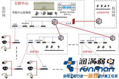 主控中心配置高性能網(wǎng)絡(luò)交換機(jī)作為視頻監(jiān)控系統(tǒng)的主交換機(jī),學(xué)校監(jiān)控專(zhuān)網(wǎng)通過(guò)防火墻與校園網(wǎng)之間互聯(lián),各校園網(wǎng)的遠(yuǎn)程監(jiān)控終端經(jīng)主控中心服務(wù)器授權(quán)可通過(guò)校園網(wǎng)查看視頻監(jiān)控信息。分控室配置上聯(lián)網(wǎng)絡(luò)交換機(jī)與主控中心網(wǎng)絡(luò)交換機(jī)相連,與前端監(jiān)控點(diǎn)采用光端機(jī)互聯(lián),各個(gè)分控室配置硬盤(pán)錄像機(jī)進(jìn)行本地錄像存儲(chǔ)。