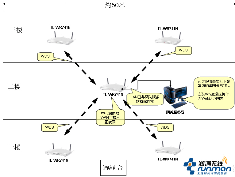 - 1.需求: 經濟連鎖型酒店為典型磚混3層樓結構,每層中間是過道,兩邊是客房。需要對所有房間進行無線信號的覆蓋,對于無線漫游暫無要求 2.設備: -TP-LINKTL-WR741N無線路由器5臺。 -其中1樓2臺,2樓1臺,3樓2臺。2樓的為
